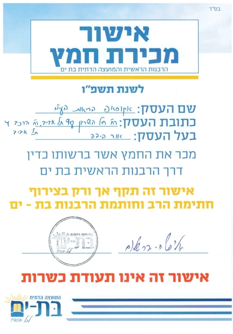 לאישור מכירת חמץ – פסח תשפ"ו – לחצו כאן