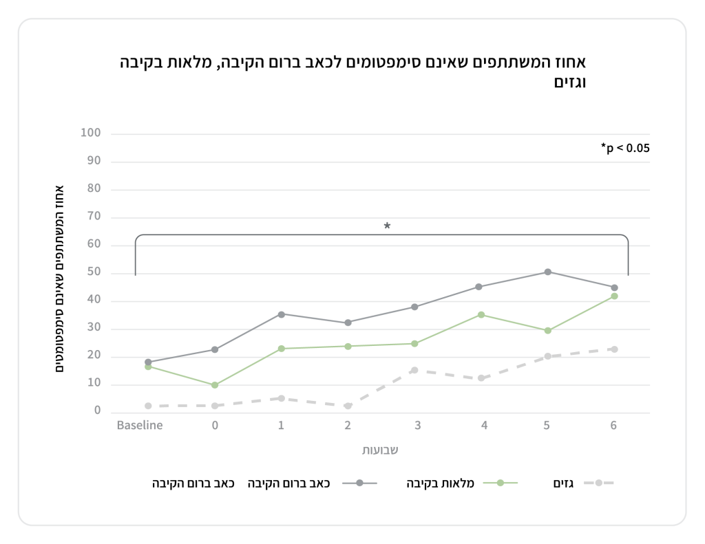 תרשים 2 – השיפור השבועי במדדי הסימפטומים העיכוליים בזמן נטילת Base It לאורך תקופת המחקר. החוקרים ציינו כי מגמת השיפור שהלכה וגדלה משבוע לשבוע מצביעה על פוטנציאל לשיפור נוסף בנטילת התוסף לאורך זמן.
