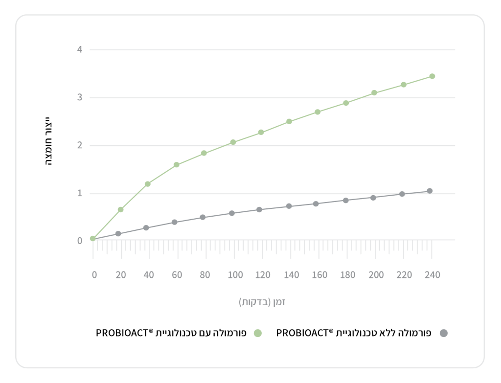 תרשים 4 – טכנולוגיית פרוביואקט תורמת לעלייה בפעילות המטאבולית של החיידקים הפרוביוטיים, הנמדדת עפ"י רמת הפרשת חומצה לקטית. הפעילות המטאבולית כשלעצמה מהווה אינדיקציה לשרידות החיידקים (חיידקים חיים הם פעילים מטאבולית ומפרישים חומצה לקטית).