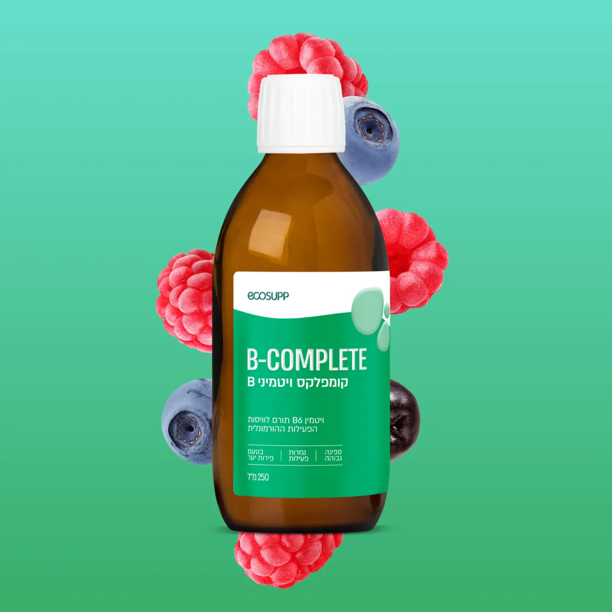 B-COMPLETE מיוצר ללא סוכר, ללא ממתיקים מלאכותיים, ללא צבעי מאכל וללא חומרים משמרים, ובתוספת תמצית טעם פירות יער ממקור טבעי – כך שהוא מתאים לשימוש יומיומי נוח.