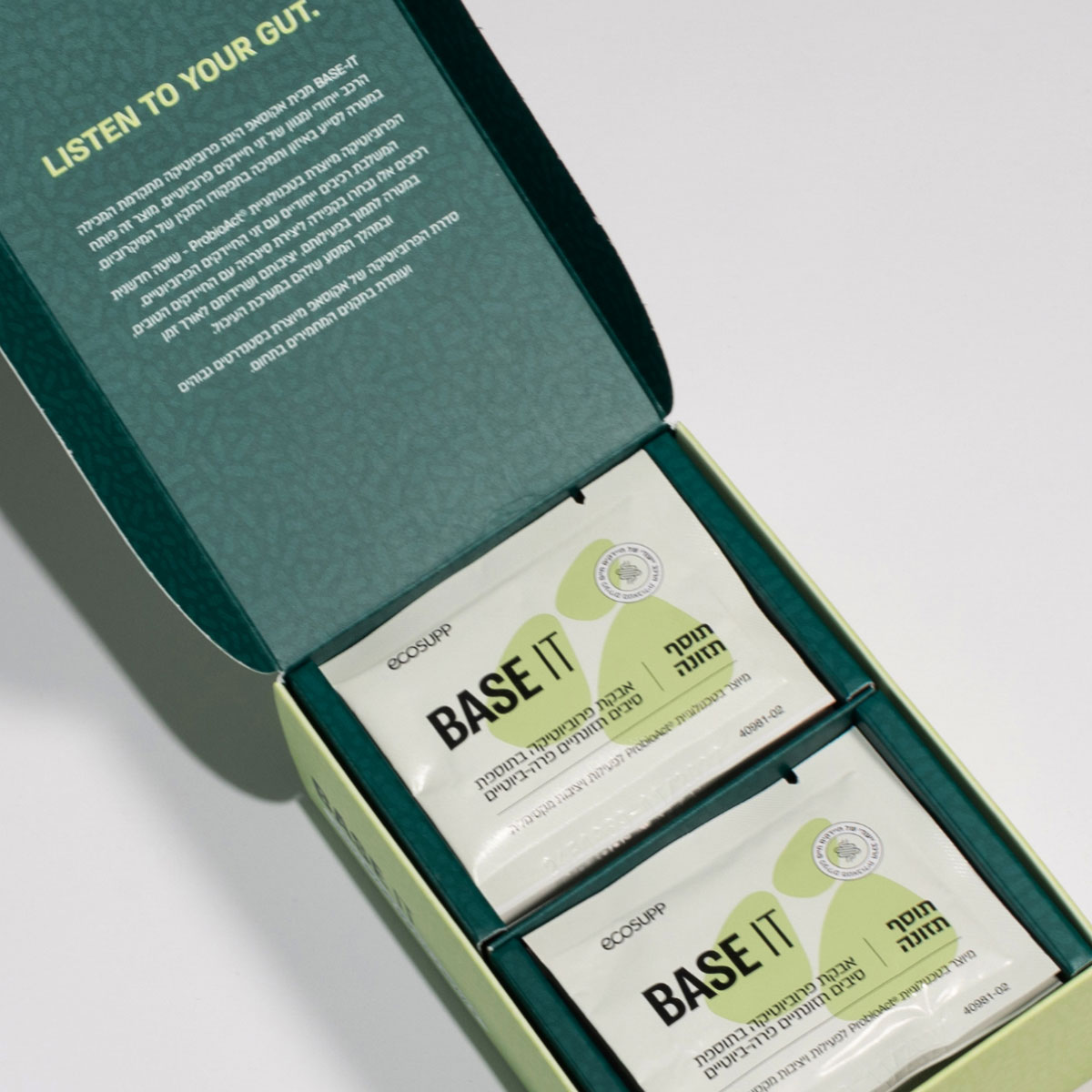 - BASE IT – פרוביוטיקה יומיומית לאיזון חכם של המיקרוביום, תמיכה עיכולית: הפחתת נפיחות, גזים ואי נוחות עיכולית ולתמיכה במערכת החיסון. מתאימה לילדים מגיל 3 ולמבוגרים.