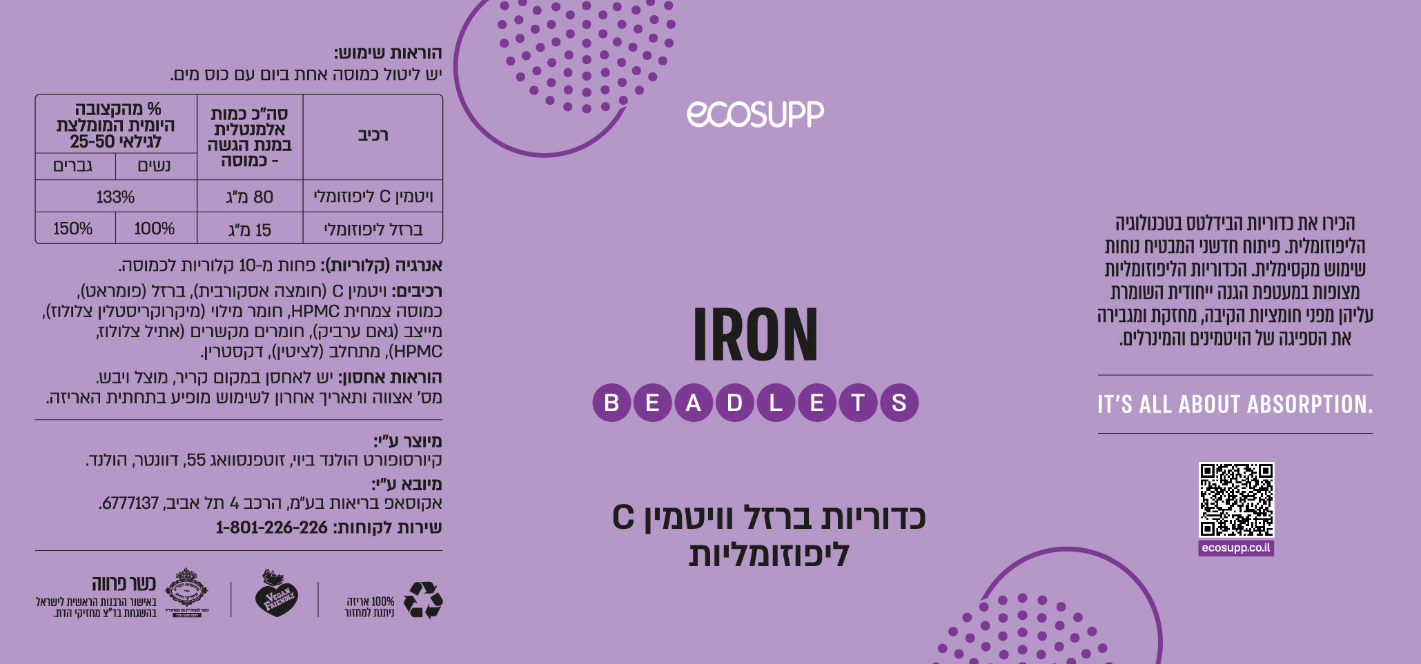 הכדוריות כוללות ליבה עם ברזל פעיל, שכבת ליפוזומים לייצוב והגנה ומעטפת HPMC צמחית לשחרור מושהה ומבוקר ללא תופעות לוואי!