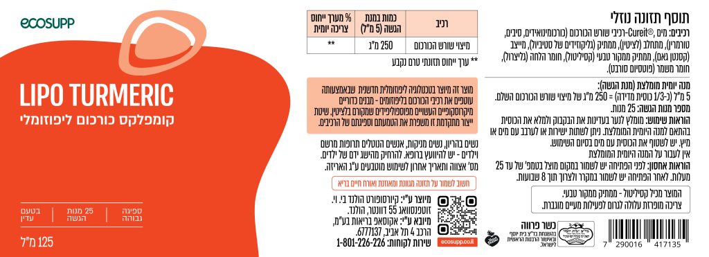 LIPO TURMERIC – מים, ®Cureit – רכיבי שורש הכורכום (כורכומינואידים, סיבים, טורמרין), מתחלב (לציטין), ממתיק (גליקוזידים של סטיביול), מייצב (קסנטן גאם), ממתיק ממקור טבעי (קסיליטול), חומר הלחה (גליצרול), חומר משמר (פוטסיום סורבט).