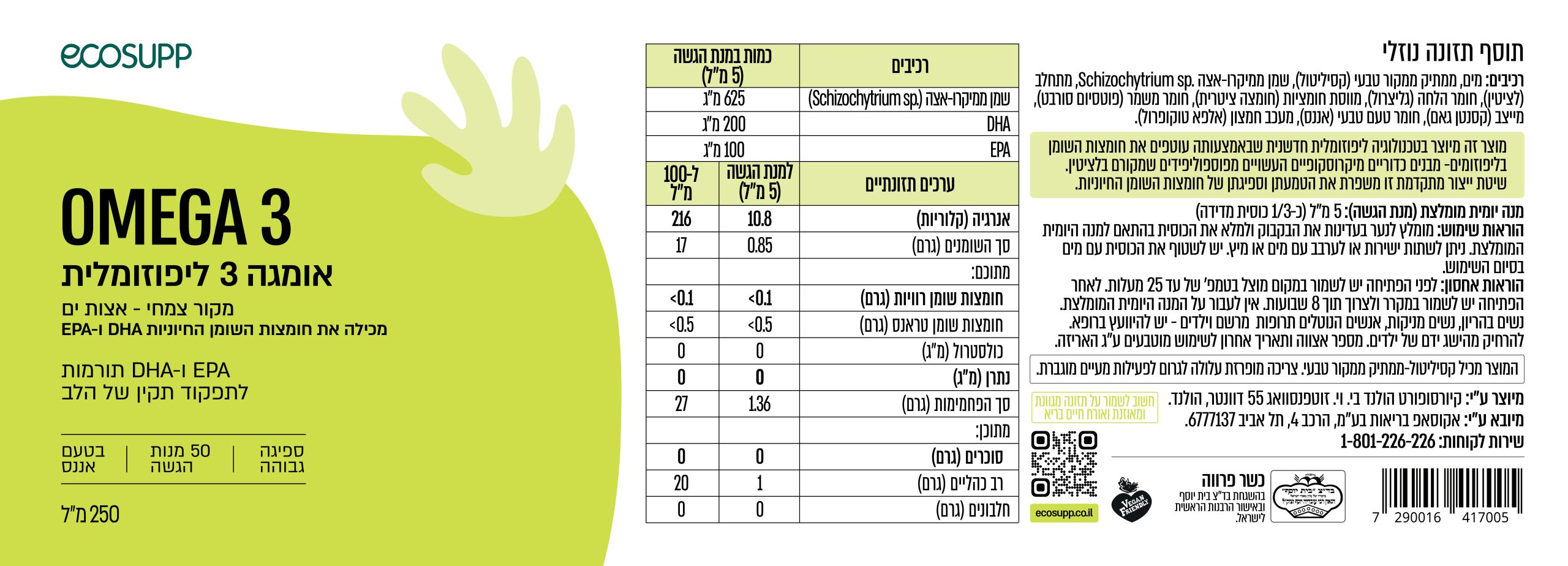 • אומגה 3 ליפוזומלית מכילה את חומצות השומן החיוניות  EPA ו-DHA, אשר מופקות מאצת ים מיקרוסקופית (Schizochytrium) המגודלת בבתי גידול ייעודיים ובתנאים אופטימליים בסביבה נקייה מרעלים וממתכות כבדות.