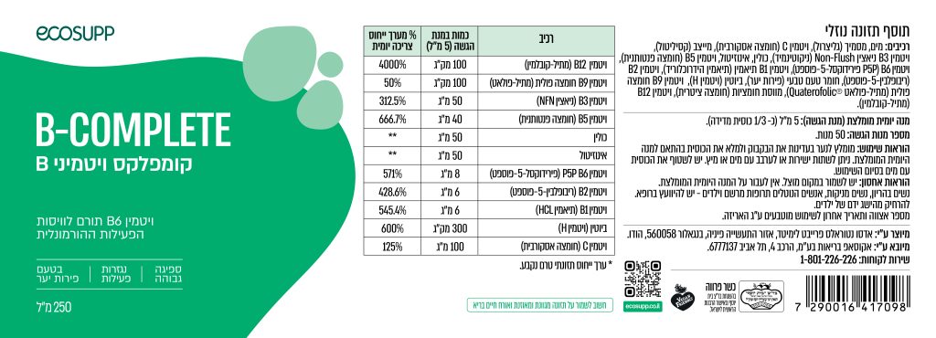 B-Complete – פורמולה נוזלית של ויטמיני B חיוניים בנגזרות הפעילות ביותר, כולל B12 מתילקובלמין, חומצה פולית מתיל-פולאט, P5P, ביוטין וויטמין C – לתמיכה באנרגיה, מערכת העצבים, העור, השיער והציפורניים.